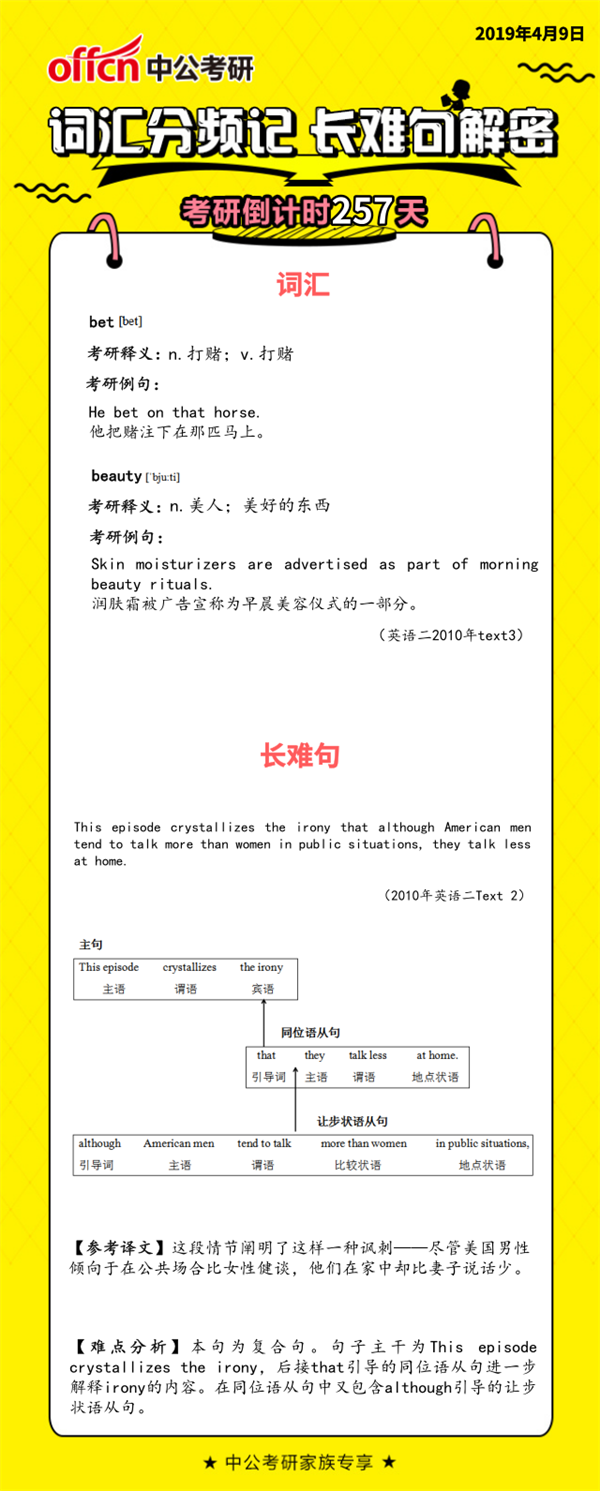 以上是四川中公考研小编为您整理的“2020考研英语:英语词汇分频记及考研英语长难句解密0409“,”预祝每位考生取得好成绩,更多考研常识相关内容尽在四川中公考研英语栏目,中公考研为广大学子推出乐学面授课、VIP一对一等系列备考课程,针对每一个科目要点进行深入的指导分析,欢迎各位考生了解咨询。同时,中公考研一直为大家推出考研直播课堂,足不出户就可以边听课边学习,为大家的考研梦想助力!
