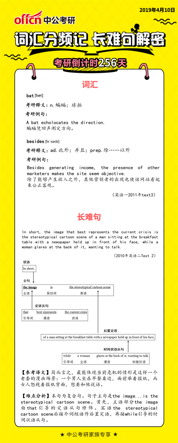 以上是四川中公考研小编为您整理的“2020考研英语:英语词汇分频记及考研英语长难句解密0410“,”预祝每位考生取得好成绩,更多考研常识相关内容尽在四川中公考研英语栏目,中公考研为广大学子推出乐学面授课、VIP一对一等系列备考课程,针对每一个科目要点进行深入的指导分析,欢迎各位考生了解咨询。同时,中公考研一直为大家推出考研直播课堂,足不出户就可以边听课边学习,为大家的考研梦想助力!