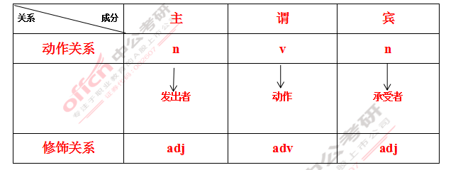 首先,对于考研完型填空来说,要做词义辨析题的时候,首先最主要的就是要理清句间关系,那么句间关系就是要找句子的主干,然后再理清句内的动作关系和修饰关系,对于一个句子来说,它的主干就是要有主谓宾,主谓宾是语法层面上的,那我们说完型填空大多数都是在做词义辨析,所以我们把主谓宾要落实到词的层面上。如下: