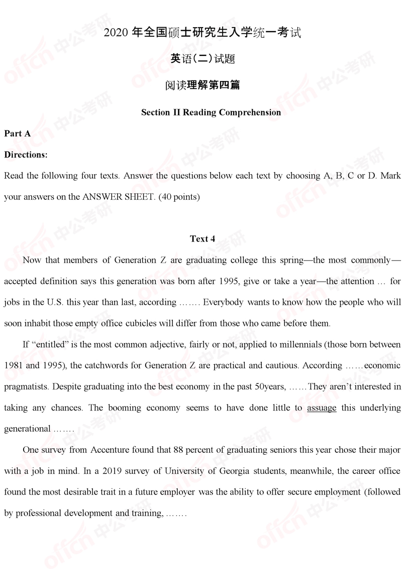 2020考研初试已正式开始,四川山西考研网初试后为大家整理发布“20考研,英语二考试答案”考研试题内容,中公考研各科研究院老师将对2020考研试题进行试题变化及难度解析,帮助大家做好考后准备、从容迎战后续复试调剂!