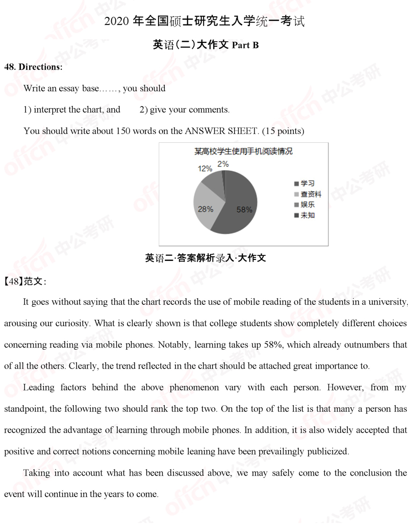 2020考研初试已正式开始,四川山西考研网初试后为大家整理发布“20考研,英语二考试答案”考研试题内容,中公考研各科研究院老师将对2020考研试题进行试题变化及难度解析,帮助大家做好考后准备、从容迎战后续复试调剂!