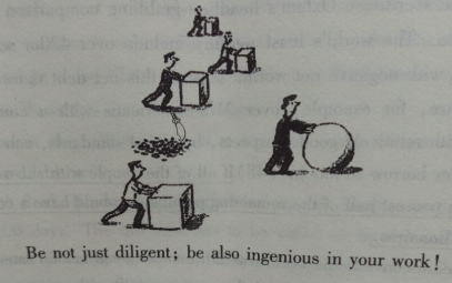 这幅图试图告诉我们仅仅努力工作是不够的,一个人需要聪明地工作。很多工作不仅需要力量和劳动力,同样也需要创力。单纯的投入时间和精力的工作方式已经过时了。实际上,短时间内完成工作是人类很初的梦想。如果我们回顾人类文明的历史,就会发现追求效率是很多发明背后的推动力。人类发明了轮子来快速运输,发明了电脑以实现快速计算,发明了电脑将世界变成一个地球村。
