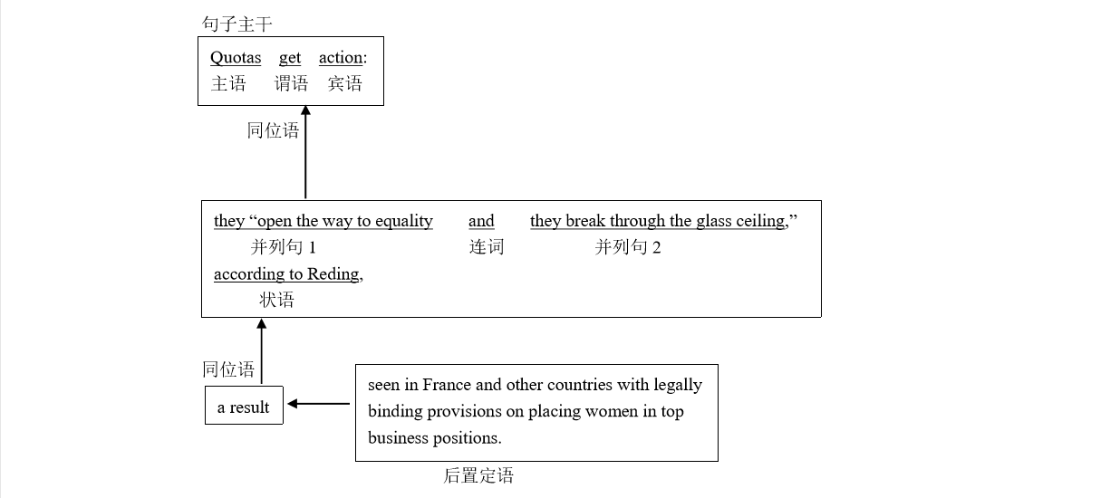 【难点分析】本句主干为Quotas get action,说明定额的作用,冒号后进一步具体解释该作用,即open the way to equality和they break through the glass ceiling,其中,the glass ceiling即玻璃天花板,指女性(或某一群体的人)在职位晋升上遇到的无形障碍。a result seen…是前面内容的同位语,以在法国和其他国家的实例进一步印证。其中,seen in France and other countries是过去分词做result的后置定语,且在这个后置定语中,with介词短语又做other countries的后置定语,即通过具有法律约束力的条款规定女性在公司上层占比的其他国家。