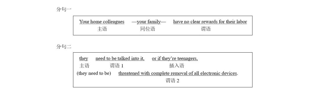 【难点分析】本句由分号一分为二,分句一与分句二之间是并列关系。分句一中两个破折号中间的your family是主语的同位语成分,说明home colleagues的确切身份;分句二中or if they’re teenagers为插入语成分。另外,分句二的谓语包括两个,第二个谓语threatened with…的前面省略了they need to be。