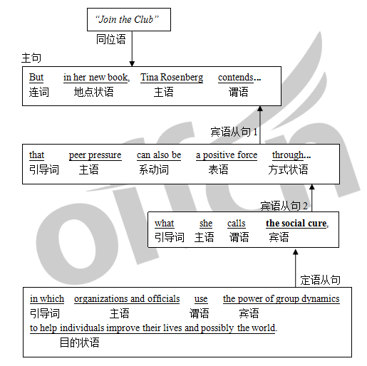 2.句子主干为Tina Rosenberg contends+that引导的宾语从句,句首的介词短语in her new book “Join the Club”作地点状语修饰主句,其中“Join the Club”为her new book的同位语;