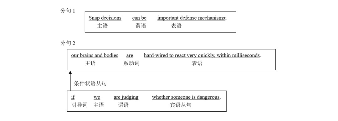 2.分号前是系表结构,说明快速反应是重要的防御机制;分号后包含if引导的条件状语从句,以人的大脑和身体会在短时间内对危险人物做出快速决策为例,说明前面所提的防御作用。