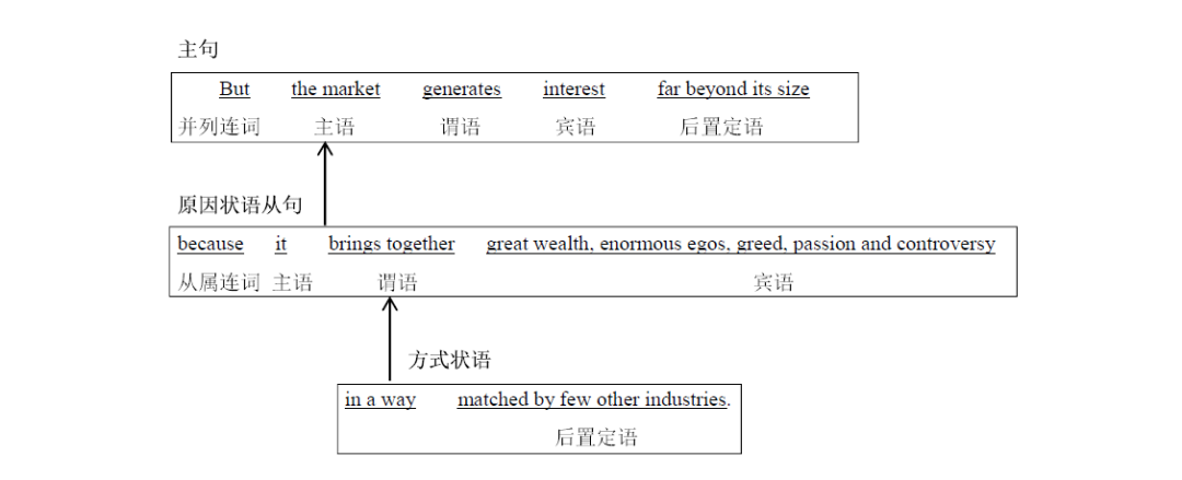 2.主句是由连词But并列的简单句the market generates interest far beyond its size,其中介词短语far beyond its size作后置定语,修饰限定interest;后接because引导的原因状语从句,该从句包含一个方式状语in a way matched by few other countries修饰其谓语部分brings together,其中过去分词短语matched by few other countries作后置定语,修饰限定前面的way。