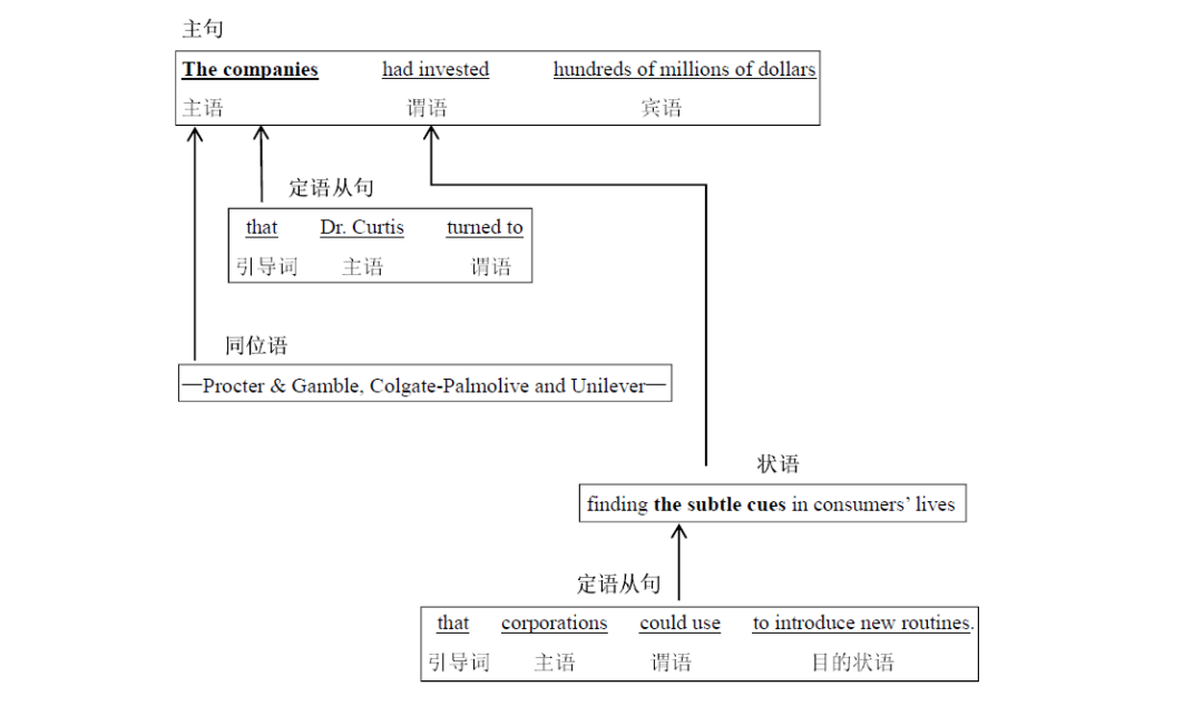 2.句子主干是The companies ... had invested hundreds of millions of dollars...首先,句子主语The companies由that引导的定语从句修饰,同时在破折号之间使用同位语具体解释。句子主干的谓语部分had invested与后面的状语finding the subtle cues in consumers’ lives形成搭配(invest … doing…),后接定语从句修饰the subtle cues。