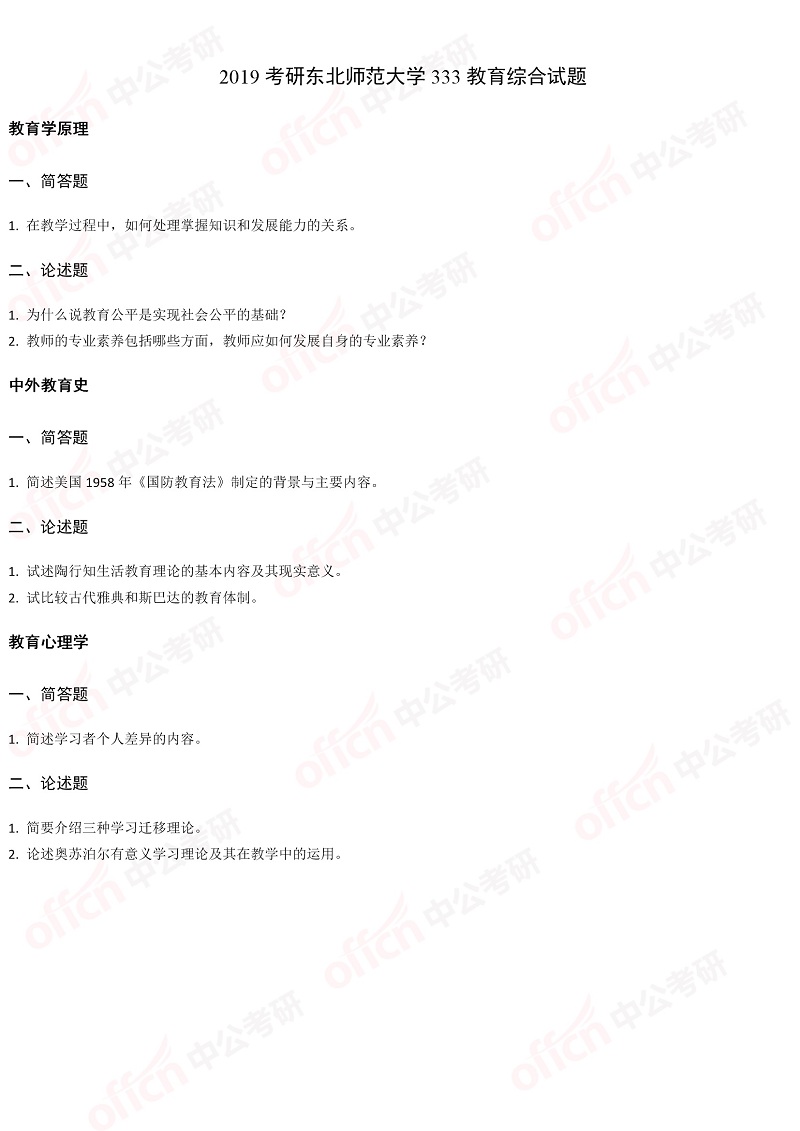 以上是四川中公考研小编为您整理的“2019考研 东北师范大学333教育综合试题”,预祝每位考生取得好成绩,更多考研英语原理相关内容尽在四川中公考研专硕频道!为了考生们更好的复习,中公考研为广大学子推出乐学面授课、VIP一对一等系列备考课程,针对每一个科目要点进行深入的指导分析,欢迎各位考生了解咨询。同时,中公考研一直为大家推出考研直播课堂,足不出户就可以边听课边学习,为大家的考研梦想助力!