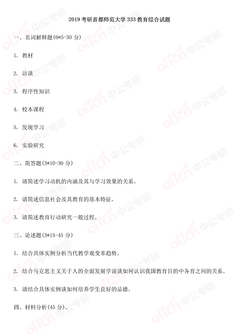 以上是四川中公考研小编为您整理的“2019考研首都师范大学333教育综合试题”,预祝每位考生取得好成绩,更多考研英语原理相关内容尽在四川中公考研专硕频道!为了考生们更好的复习,中公考研为广大学子推出乐学面授课、VIP一对一等系列备考课程,针对每一个科目要点进行深入的指导分析,欢迎各位考生了解咨询。同时,中公考研一直为大家推出考研直播课堂,足不出户就可以边听课边学习,为大家的考研梦想助力!