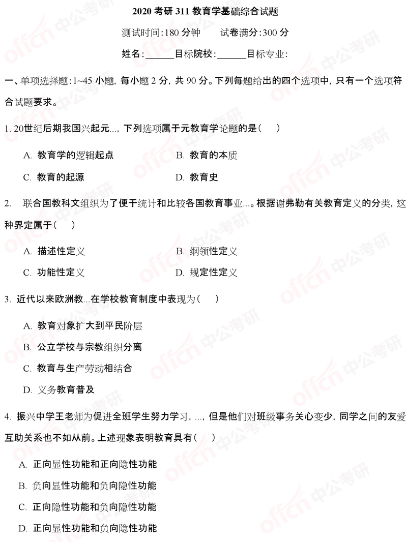 2020考研初试已正式开始,中公考研网初试后为大家整理发布“2020考研,311教育学基础综合试题单选题1(中公考研版)”考研试题内容,中公考研各科研究院老师将对2020考研试题进行试题变化及难度解析,帮助大家做好考后准备、从容迎战后续复试调剂!【考研复试攻略】/【调剂备战指南
