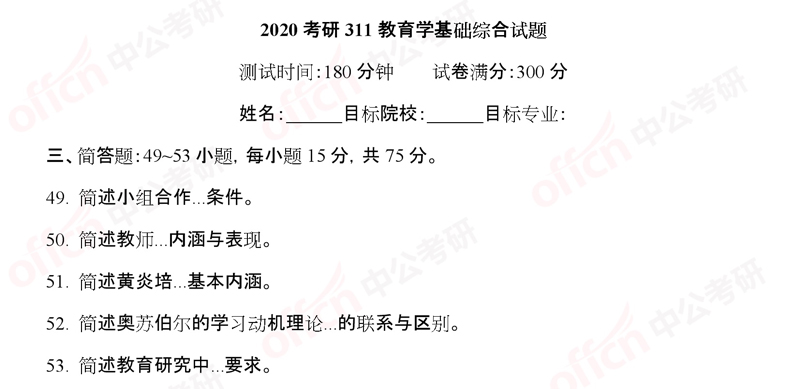 2020考研初试已正式开始,中公考研网初试后为大家整理发布“2020考研311教育学基础综合试题简答题原文(中公考研版)”考研试题内容,中公考研各科研究院老师将对2020考研试题进行试题变化及难度解析,帮助大家做好考后准备、从容迎战后续复试调剂!【考研复试攻略】/【调剂备战指南