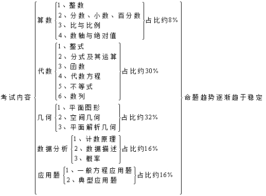 在考试范围方面,主要涵盖了算数、代数、几何、数据分析、应用题几个部分。详细内容如下: