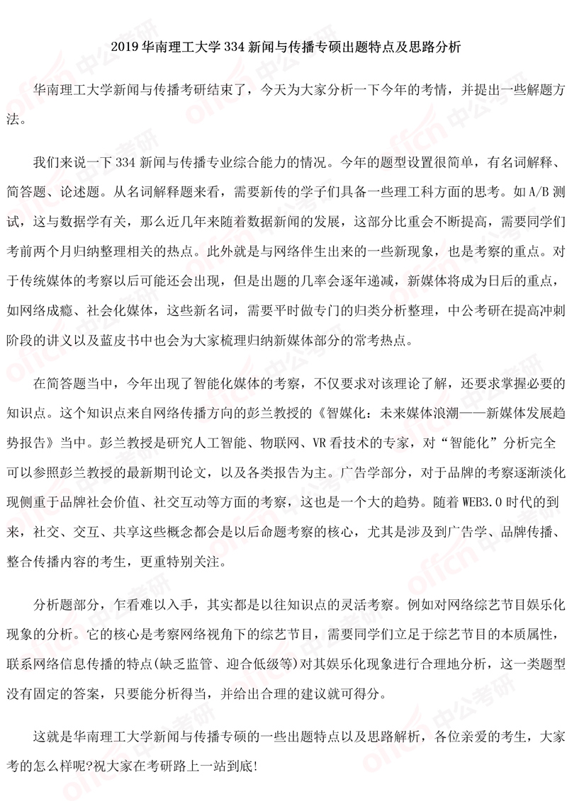 以上是四川中公考研小编为您整理的“2019华南理工大学334新闻与传播专硕出题特点及思路分析”,预祝每位考生取得好成绩,更多考研常识相关内容尽在四川中公考研真题解析频道!为了考生们更好的复习,中公考研为广大学子推出乐学面授课、VIP一对一等系列备考课程,针对每一个科目要点进行深入的指导分析,欢迎各位考生了解咨询。同时,中公考研一直为大家推出考研直播课堂,足不出户就可以边听课边学习,为大家的考研梦想助力!