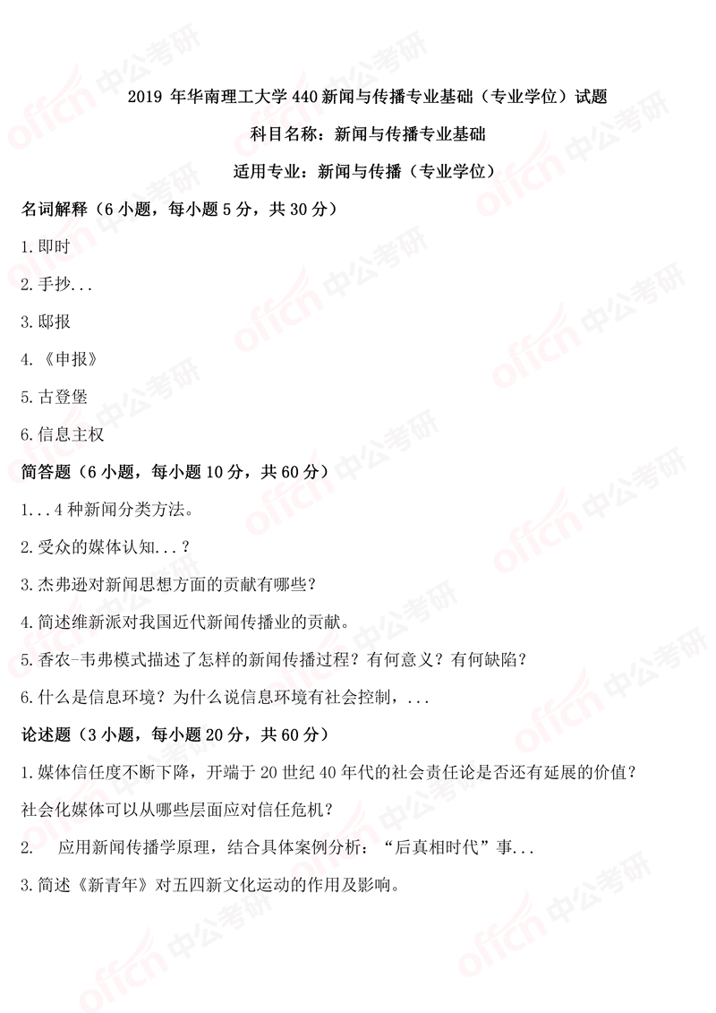 以上是四川中公考研小编为您整理的“2019年华南理工大学440新闻与传播职业基础考研试题(职业学位)”,预祝每位考生取得好成绩,更多考研常识相关内容尽在四川中公考研真题解析频道!为了考生们更好的复习,中公考研为广大学子推出乐学面授课、VIP一对一等系列备考课程,针对每一个科目要点进行深入的指导分析,欢迎各位考生了解咨询。同时,中公考研一直为大家推出考研直播课堂,足不出户就可以边听课边学习,为大家的考研梦想助力!
