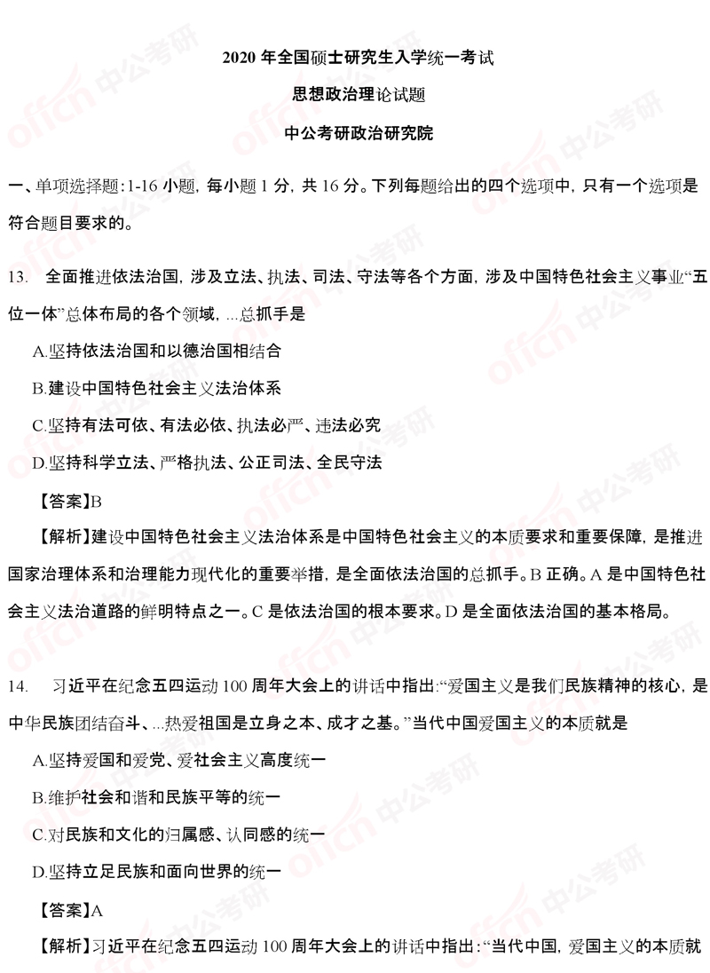 2020考研初试已正式开始,四川中公考研网初试后为大家整理发布“2020考研政治思法单选题13-14试题及答案解析(中公考研版)”考研试题内容,中公考研各科研究院老师将对2020考研试题进行试题变化及难度解析,帮助大家做好考后准备、从容迎战后续复试调剂!