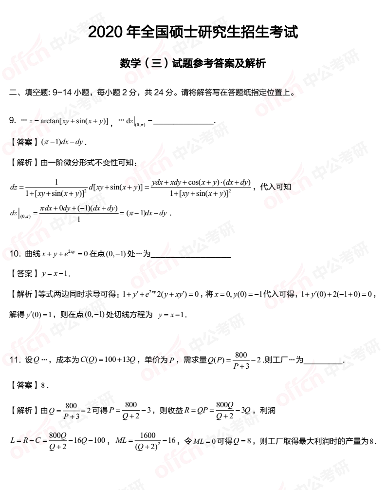 2020考研初试已正式开始,四川研究生招生信息网初试后为大家整理发布“2020考研数学三填空题试题及答案解析汇总(中公考研版)”考研试题内容~