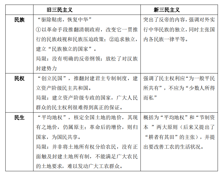 1924年1月,国民党一大在广州召开,大会的宣言对三民主义作出了新的解释:在民族主义中突出了反帝的内容,强调对外实行中华民族的独立,同时主张国内各民族一律平等;在民权主义中强调了民主权利应“为一般平民所共有”,不应为“少数人所得而私”;把民生主义概括为“平均地权”和“节制资本”两大原则(后来又提出了“耕者有其田”的主张),并提出要改善工农的生活状况。这个新三民主义的政纲同中共在民主革命阶段的纲领基本一致,因而成为国共合作的政治基础。大会实际上确定了联俄、联共、扶助农工三大革命政策。这样,国民党一大的顺利召开,就标志着第一次国共合作的正式形成。