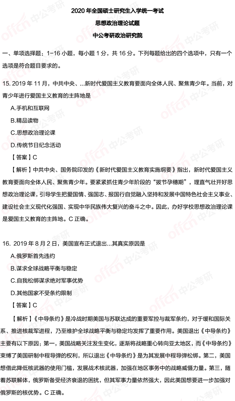 2020考研政治时政热点单选题15-16试题及答案解析(中公考研版)