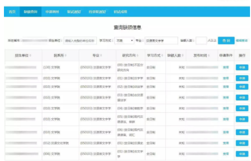 点击【缺额查询】,如果你已经确定了调剂院校,可以直接点击【申请调剂】,需要注意的是,部分院校可能直到调剂系统正式开放之后才公布调剂信息,而有的院校可能在调剂系统开放后第二天才出调剂信息。