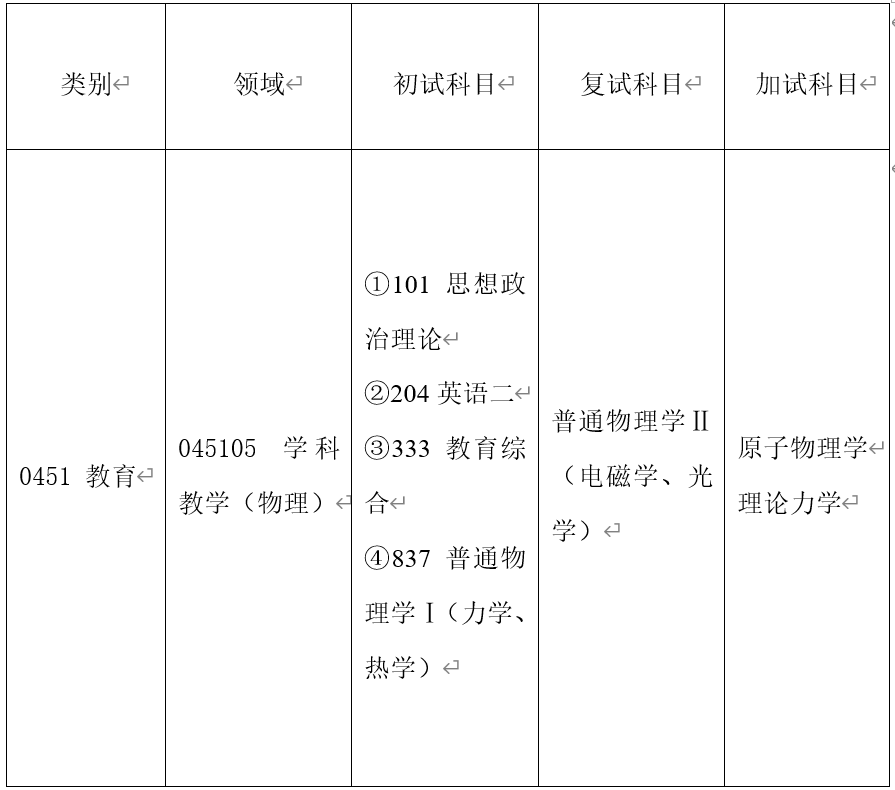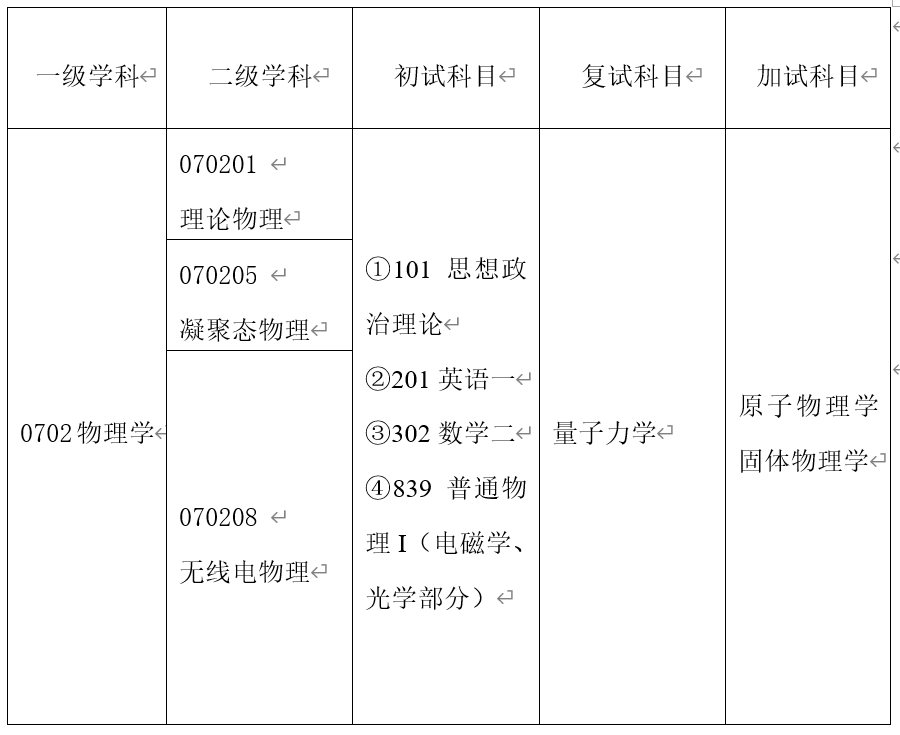 物理学(理论物理,代码:070201;凝聚态物理,代码:070205;无线电物理,代码:070208)拟接收15-30人;电子信息,代码:0854,拟接收调剂15-20人;学科教学(物理),代码:045105,拟接收3-6人。具体准确调剂名额将在“全国硕士生招生调剂服务系统”中公布,请以教育部调剂系统公布为准。