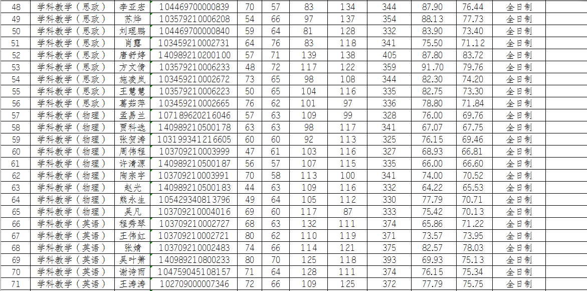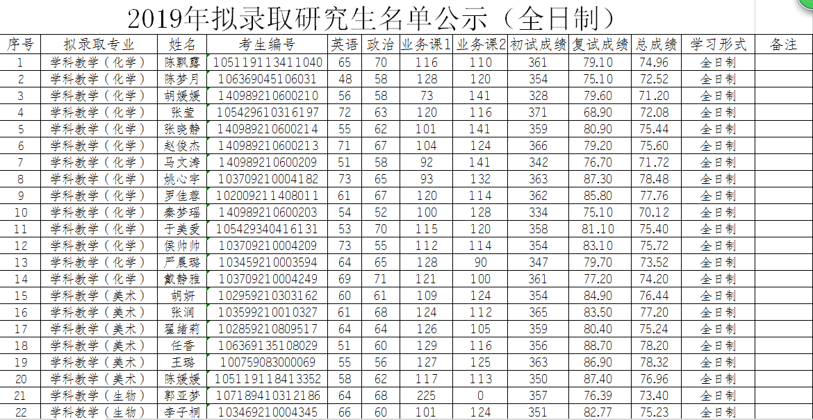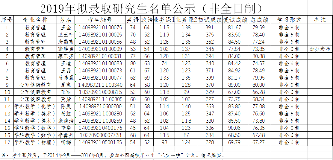根据教育部和省考试院有关文件精神,按照《合肥师范学院2019年硕士研究生招生复试录取办法》要求,本着“公平、公正、公开”和“择优录取”的原则,经过初试、复试、政审、体检等环节,按总成绩由得分到低分确定拟录取名单。报经学校研究生招生工作领导组审定,确定拟录取日制教育硕士98人,非日制教育硕士17人(见下表)。 现予以公示,公示时间为10个工作日。公示期:2019年4月12日至4月25日。若对公示名单有异议,请于公示期内与合肥师范学院研究生处(0551-63676140)或纪委监察处(0551-63828650)联系。