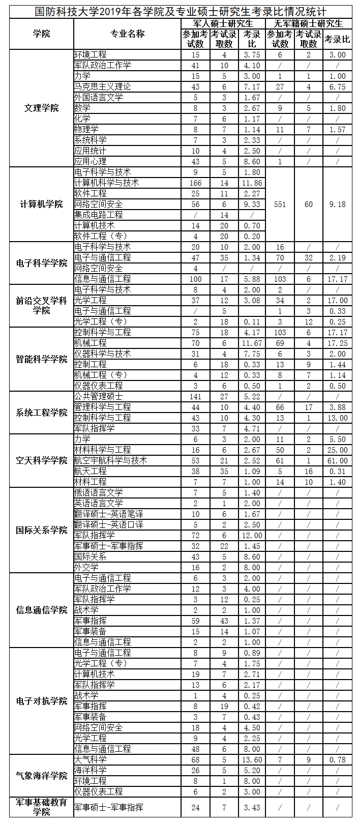 据国防科技大学研究生院消息,2019年国防科技大学考研报录比已出,详情如下: