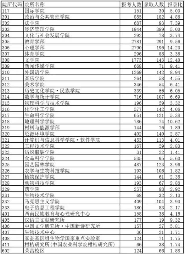 以上是四川中公考研小编为您整理的“西南大学2019年考研报录比,预祝每位考生取得好成绩,更多考研常识相关内容尽在四川中公考研报录比频道,中公考研为广大学子推出乐学面授课、VIP一对一等系列备考课程,针对每一个科目要点进行深入的指导分析,欢迎各位考生了解咨询。同时,中公考研一直为大家推出考研直播课堂,足不出户就可以边听课边学习,为大家的考研梦想助力!