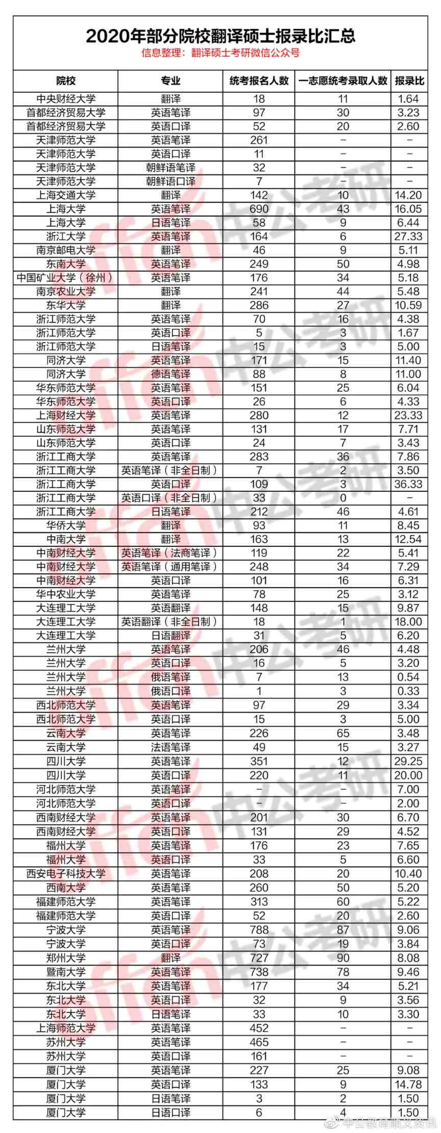以下是 39 所高校 2020 年翻译硕士报录比合集,觉得有用的同学可以点赞、在看、收藏,如果可以转发支持一下就更好啦—