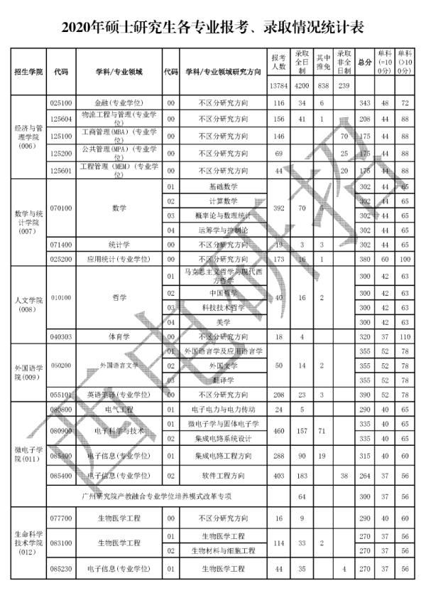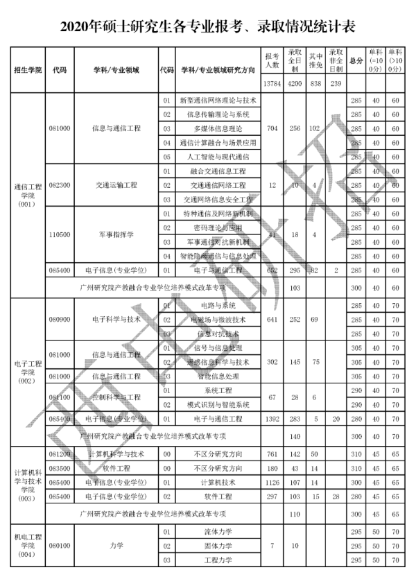 统考共有13784人报考,共录取4439名硕士,其中非全日制239名,全日制4200名(包括838名推免生)。2020年西电统考硕士研究生整体的报录比不足4:1,且优势学科复试线并没有像一些热门高校动辄400+,比如通信学院信息与通信工程,复试线285分(国家线264分),电子学院各专业的复试线也并不是特别高,作为信息与电子、通信类强校,西安电子科技大学真的是性价比较高的一所学校。