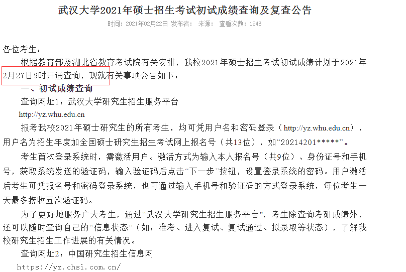根据教育部及湖北省教育考试院有关安排,我校2021年硕士招生考试初试成绩计划于2021年2月27日9时开通查询,现就有关事项公告如下: