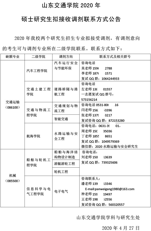 原标题:2020年硕士研究生拟接收调剂联系方式公告