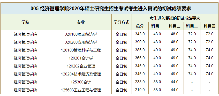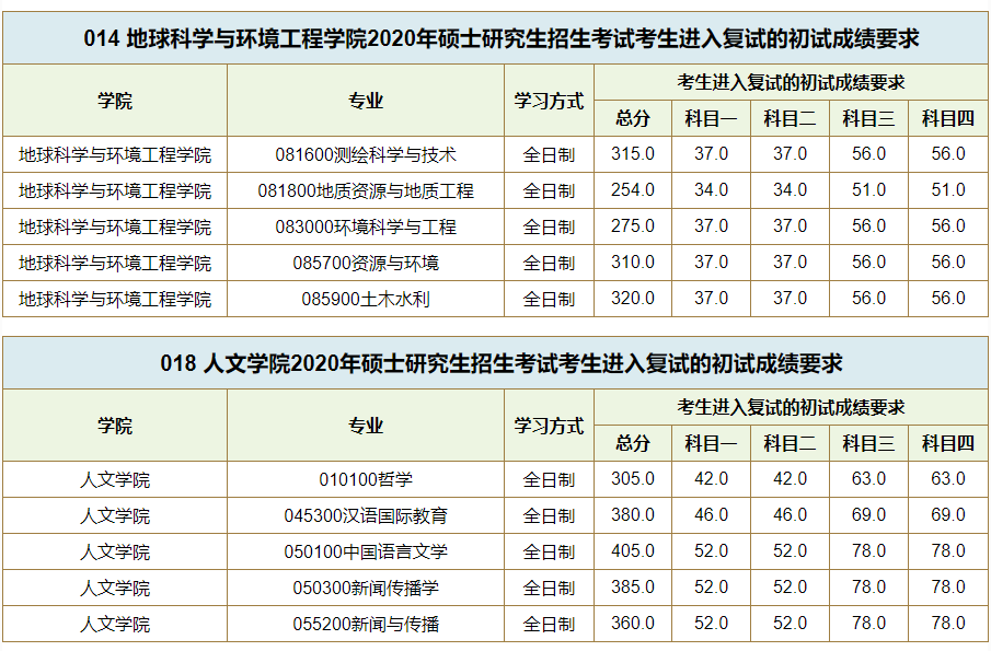 根据教育部有关文件精神,结合我校实际情况,经学校和各招生单位研究生招生工作领导小组审定,我校2020年硕士研究生招生考试各专业考生进入复试的初试成绩要求如下表(陆续更新),请关注本网站发布的最新信息。