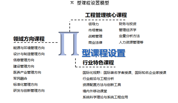 清华工程管理硕士学科的课程设置,紧密结合行业实际,以模块的方式进行设置,力求工程与管理的佳结合,既有管理类的核心课程,也有工程技术方面的职业领域课程,还有行业特色模块,培养跨领域复合的π型管理人才。