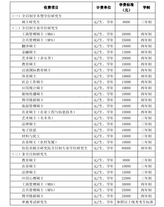第十五条 2020 年硕士研究生学费收缴标准及学制如下: