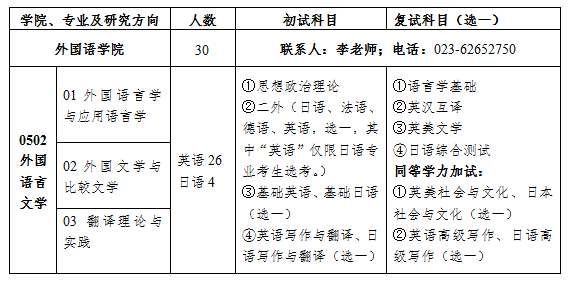 学院外国语言文学硕士点设立三个研究方向:外国语言学与应用语言学、外国文学与比较文学、翻译理论与实践。
