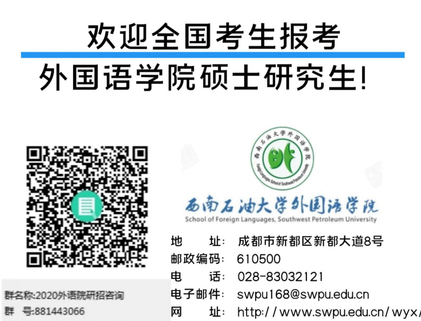 西南石油大学是一所中央与地方共建、以四川省人民政府管理为主的高等学校。2017年9月,入选为国家首批“双一流”世界一流学科建设高校(全国95所高校之一)。外国语学院始建于1958年,前身为本校基础学科部的外语教研室,已有五十多年的发展历史。1978年开始招收英语专业本科生。2000年获“外国语言学及应用语言学”硕士学位授权点,2010年获翻译硕士(MTI)专业学位授权点。学院现下设大学英语教研室、英语专业教研室、俄语专业教研室、国际培训部、语言实验室等机构。拥有英语、俄语2个本科专业;承担全校本科生英、俄、日、法等语种的公共外语教学及非英语专业硕博研究生的外语教学任务。