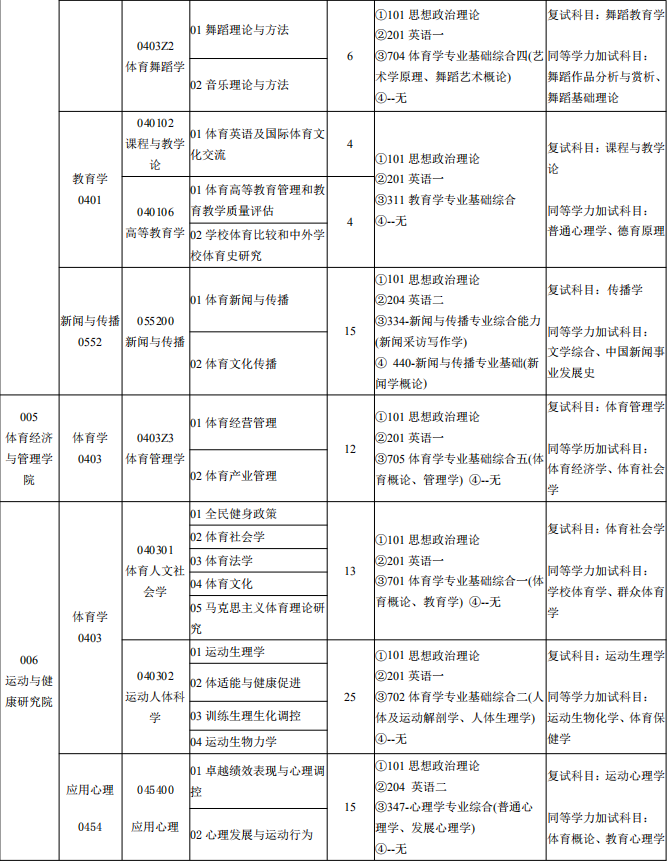 复试时进行专业课笔试、外国语听力及口语测试、综合面试,体育教育训练学专业、民族传统体育学专业、体育舞蹈学专业、体育硕士还须进行运动技能考试。同等学力考生复试时须加试(笔试)两门本科主干课程的考试。具体复试要求详见复试前我校科研与研究生处公布的复试办法。
