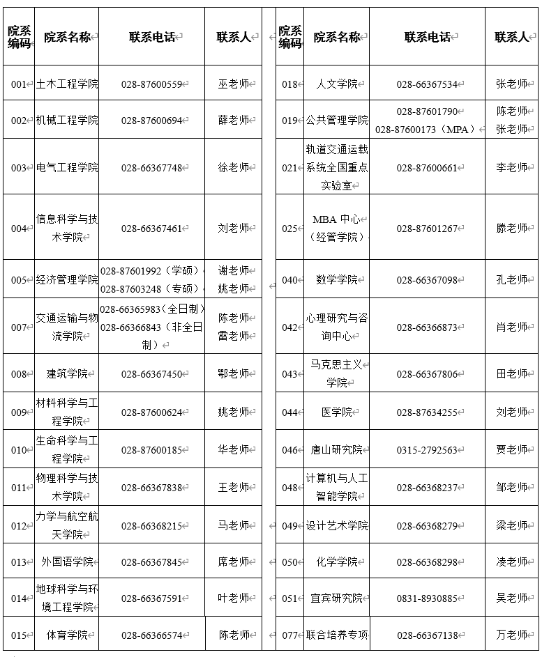西南交通大学2024年硕士研究生招生院系联系人一览表