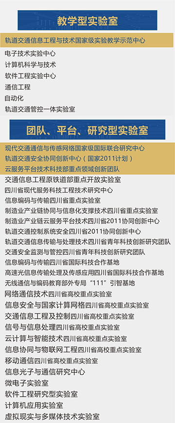 学院拥有包括国家级国际科技合作基地、国家级实验教学示范中心在内的6个教学型实验室、22个研究型实验室、14个共建实验室和面向全校的计算机实训基地,建成了国内唯一集通信网络与信息安全系统为一体的“现代通信网络与信息安全实验平台”,拥有国内一流实践教学条件,建立了12个校内外实习基地,并与知名IT类企业、轨道交通企业展开了联合培养。学生在校期间可根据自己的兴趣选择进入实验室、创新中心和研究所参与科研项目。
