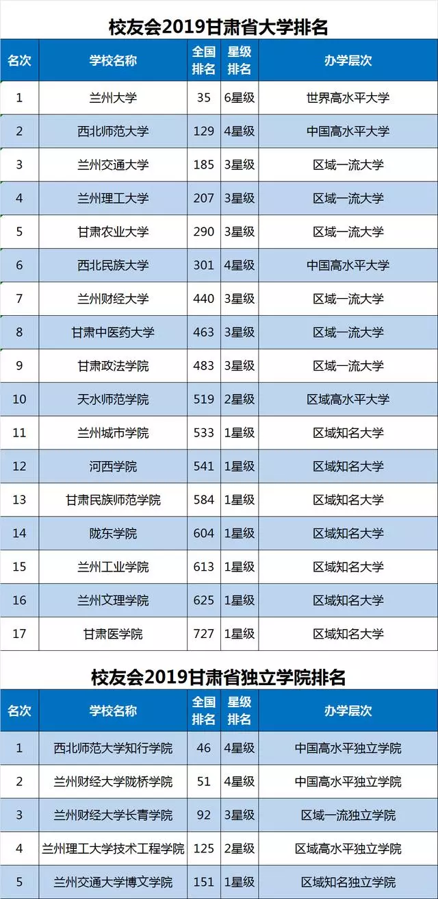 艾瑞深中国校友会网新公布校友会2019中国两岸四地大学排名500强、2019中国大学分档次排名和2019中国各省市区大学排名等榜单。值得关注的是,安徽省共有1所好校跻身2019中国大学排名百强行列,兰州大学、西北师范大学、兰州交通大学雄居2019安徽省大学排名前3强。