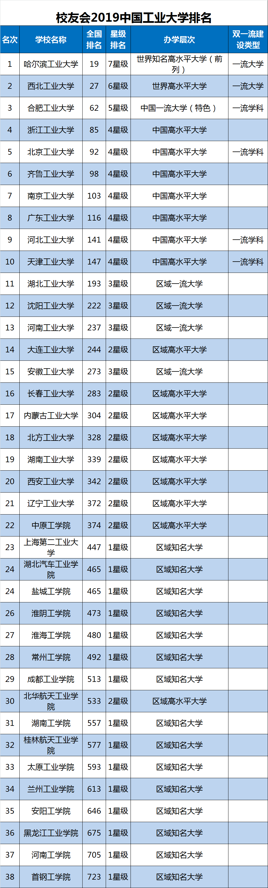 报告发布2019中国工业大学排名,哈尔滨工业大学、西北工业大学、合肥工业大学位列校友会2019中国工业大学排名前3强,全国仅有6所“工业”大学跻身国家“双一流”建设高校名单。