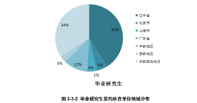 从签约单位地域来看,辽宁大学硕士和博士毕业生大多数以辽宁省内和其他东部省份就业为主,分别占总地域分布的41.09%和34.28%,签约中西部地域的毕业生分别占11.54%和3.29%,签约北京、上海和广东的毕业生占9.78%。