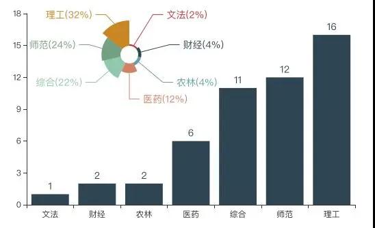 从院校类型来看,理工类>师范类>综合类,这也与我国总体院校类型分布比例不无关系,理工类院校在全国数量居首,在双非前50名院校中以16所院校数量居第一位,占比32%。
