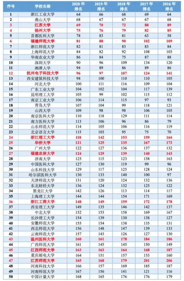江苏大学、扬州大学、福建师范大学、杭州电子科技大学、浙江理工大学、华侨大学、福建农林大学、浙江工商大学、温州医科大学、江西师范大学和江苏师范大学共11所高校保持了连续5年排名都持续前进的好成绩,值得关注!下一轮的双一流黑马很有可能就会在这些高校中产生!