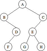 首先,我们知道,先序遍历序列是根左右的形式即DLR形式,对于上面的例题而言,先序序列中的第一个结点A就是根结点;中序遍历序列是左根右的形式即LDR形式,所以当我们由先序序列确定出A是根结点之后,A把中序序列分成两个子序列,A左面的序列就是根结点A左子树上的结点集合,A右面的序列就是根结点A右子树上的结点集合,对于左右两子树的集合,我们又可以通过先序序列中先出现的结点确定哪个结点是子树的根,比如左子树结点集合为B,F,D组成,而在先序序列中B先于D和F出现,说明B是根A的左子树的根,相应的,C是根A的右子树的根,以此类推,得到由先序序列:ABDFCEGH以及中序序列:BFDAGEHC确定的唯一一棵二叉树,如下图所示。简言之,由先序序列确定哪些结点是根或子树的根,由中序序列确定哪些结点是左子树结点集合以及右子树结点集合。同理,由后序序列和中序序列也可唯一确定一棵二叉树。