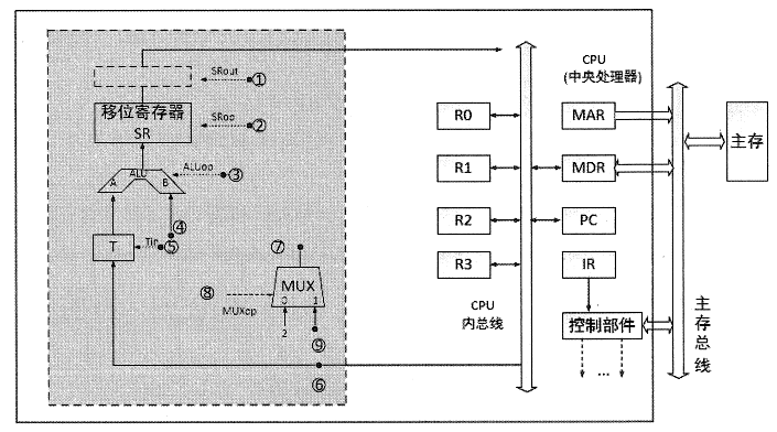 (3)信号SRout所控制的部件是一个三态门,用于控制移位器与总线之间数据通路的连接与断开。