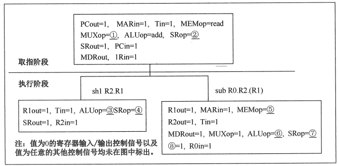 (3)假设寄存器X的输入和输出控制信号分别为Xin和Xout,其值为1表示有效,为0表示无效(例如,PCout=1表示PC内容送总线);存储器控制信号为MEMop,用于控制存储器的读(read)和写(write)操作。写出题图5-8中标号①~⑧处的控制信号或控制信号的取值。