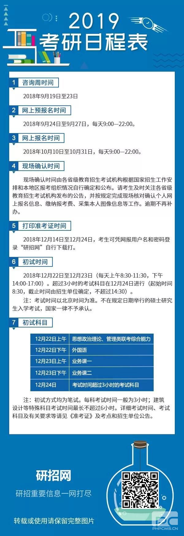 以上是四川中公考研为大家准备整理的2019年研究生招生考试日程表相关备考内容。了解更多考研复习内容,敬请关注四川中公考研。另外,为了帮助考生更好地复习,四川中公考研为广大学子推出秋季集训营系列备考专题课程,针对每一个科目要点进行深入的指导分析,还会根据每年的考研大纲进行针对性的解析哦~欢迎各位考生了解咨询。