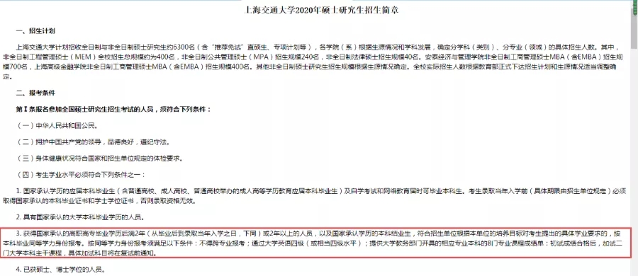 上海交通大学在2020年招生简章中提到,明确要求此类学生需要通过英语四六级才可以进行报考。